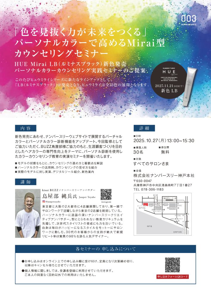 ヒュウミライ新色ルミナスブラックの発売にあわせまして「色を見抜く力が未来をつくる」パーソナルカラーで高めるMirai型カウンセリングセミナーを開催いたします。